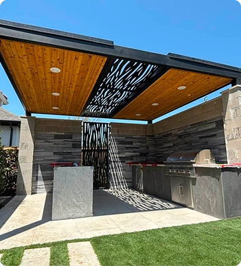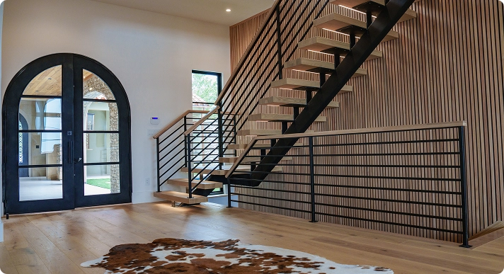 Details are engineered and custom‑fabricated in‑house in Texas, with trusted partners only for specialty woodwork and finishes to match the design intent.
